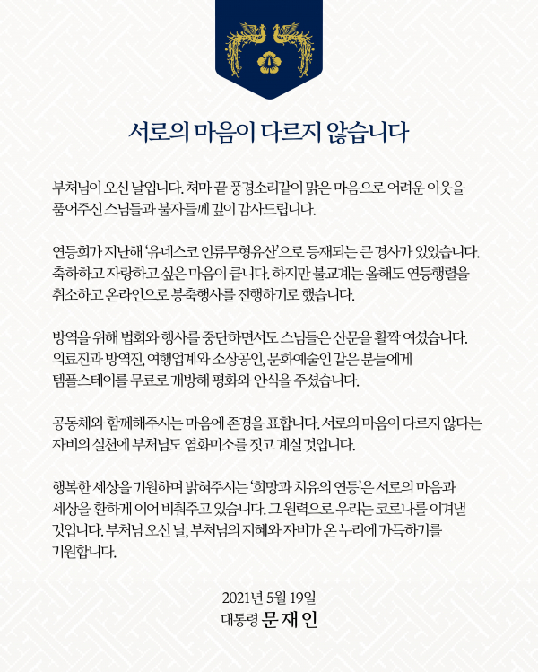 문 대통령은 이날 사회관계망서비스(SNS)에 ‘서로의 마음이 다르지 않습니다’라는 제목으로 “부처님이 오신 날이다. 처마 끝 풍경소리같이 맑은 마음으로 어려운 이웃을 품어주신 스님들과 불자님께 깊이 감사드린다”는 내용의 메시지를 남겼다.