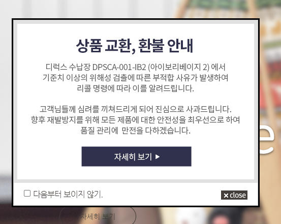 이 제품은 넉넉한 수납공간과 실용적인 디자인으로 일부 색상은 품절될 정도로 소비자들 사이에서 인기를 끌었다. 그러나 국표원 조사 결과 해당 제품 내 흰색 플라스틱 프레임에서는 기준치 1.2배를 초과하는 카드뮴(측정값: 88mg/kg, 기준치: 75mg/kg 이하)이 검출됐다.
