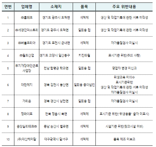 위반업체는 △홈테크 △세경인더스트리 △버블코리아 △월드산업 △무지개장애인근로사업장 △대한제지 △가리온 △정라이프 △금강실리테크 △대산케미칼 등 10곳이다.