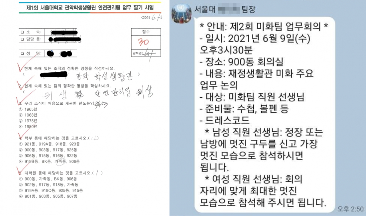 팀장은 청소노동자 회의를 만들어 필기구를 지참하지 않으면 감점하겠다고 협박했고, 업무에 불필요한 문제를 출제해 시험을 치르게 했다. 시험 후 채점해 점수를 공개함으로써 노동자들에게 모욕감을 안기고 스트레스를 유발했다.