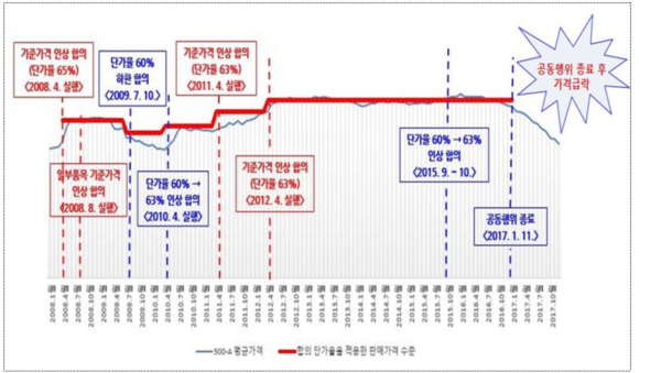 콘크리트 파일의 판매가격은 ‘기준가격×단가율’로 책정되는데, 24개사는 2008년 4월부터 2017년 1월까지의 기간 동안 이러한 기준가격을 총 4차례 인상하기로 합의하는 한편, 단가율의 경우 60% ~ 65% 수준으로 그 하한을 설정하기로 합의, 콘크리트 파일의 판매가격을 인상·유지했다.
