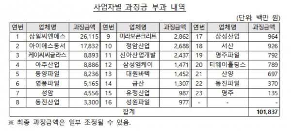 과징금 규모는 삼일씨엔에스가 261억원, 아이에스동서가 178억원, 케이씨씨글라스 및 아주산업이 각 89억원, 동양파일이 82억원, 영풍파일이 52억원, 성암이 46억원, 동진산업이 33억원 순이다.