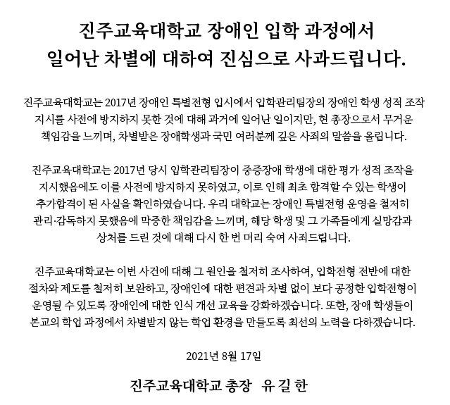 진주교대 유길한 총장은 “입학관리팀장의 장애인 학생 성적조작 지시를 사전에 방지하지 못한 것에 대해 현 총장으로서 무거운 책임감을 느끼고, 차별받은 학생과 국민께 깊은 사죄의 말씀을 올린다”고 밝혔다.