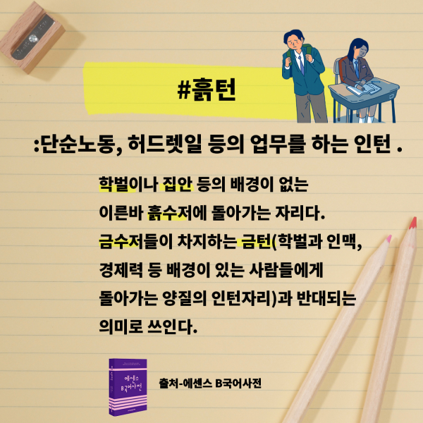 금수저들이 차지하는 금턴(학벌과 인맥, 경재력 등 배경이 있는 사람들에게 돌아가는 양질의 인턴자리)과 반대되는 의미로 쓰인다.