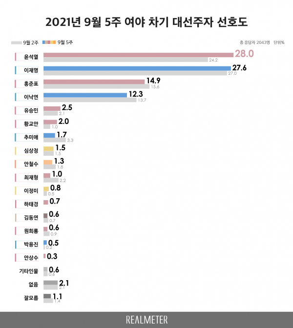 30일 리얼미터는 오마이뉴스 의뢰로 지난 27~28일 이틀간 전국 만 18세 이상 남녀 2043명을 대상으로 9월 5주 차기 대선주자 선호도 조사(표본오차 95% 신뢰 수준, ±2.2%p. 중앙선거여론조사심의위원회 홈페이지를 참조)를 실시한 결과, 윤 전 총장이 지난 9월 2주 조사 대비 3.8%p 오른 28.0%, 이 지사가 0.6%p 상승한 27.6%를 기록하며 윤 전 총장이 오차범위 내에서 앞섰다고 밝혔다.