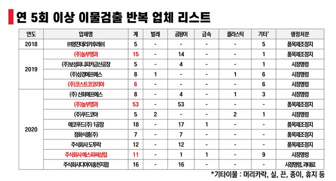 실제로 자료를 살펴보면 반복적인 이물 혼입 업체 중에서 한해 53회(놀부명과)의 이물이 혼입된 사례도 확인됐다.