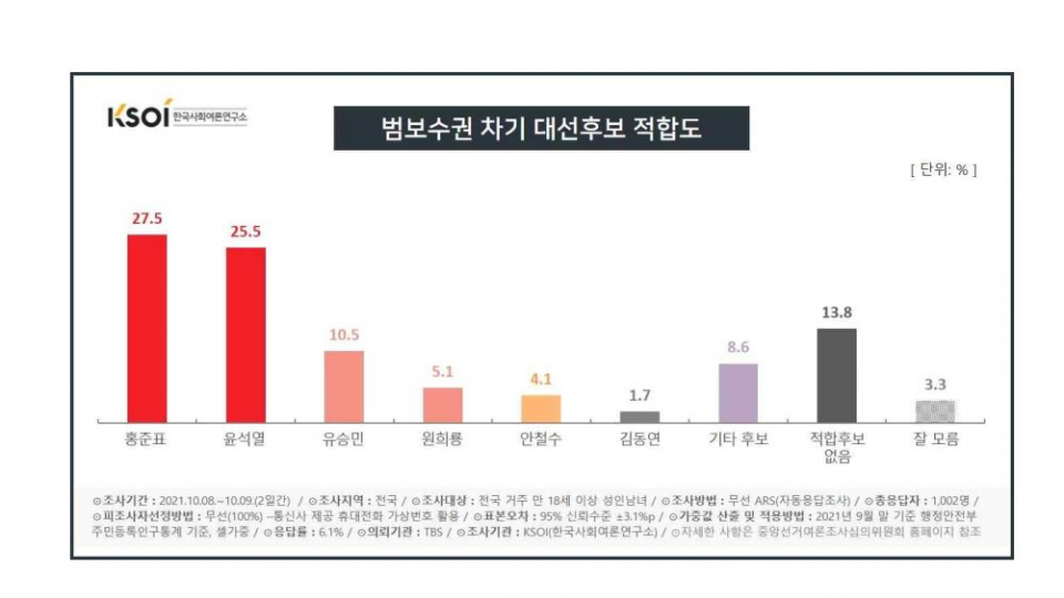 한국사회여론연구소(KSOI)가 TBS 의뢰로 전국 만 18세 이상 성인 남녀 1002명을 대상으로 지난 8~9일 실시해 이날 발표한 ‘범보수권 차기 대선후보 적합도 조사’ 결과, 홍 의원은 27.5%의 지지를 얻었고 윤 전 총장은 25.5%를 받았다. 뒤이어 유승민 전 의원은 10.5%, 원희룡 전 제주지사는 5.1%, 안철수 국민의당 대표는 4.1% 순이다.