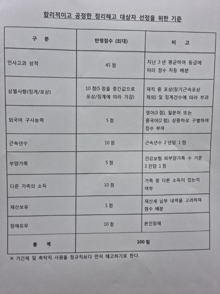 이에 그치지 않고 ‘합리적이고 공정한 정리해고 대상자 선정을 위한 기준’이라는 이름으로 정리해고 대상자 선정을 이어가고 있다고 노동계는 호소했다.