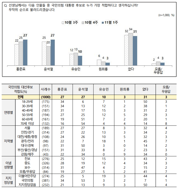 지역별로 서울에서 윤 후보와 홍 후보 모두 27%의 지지율로 동률이었고 인천·경기·충청 세 곳은 두 후보가 2~3%포인트 차로 접전이었다. 호남에서는 홍 후보가 22%로 윤 후보(7%)를 앞질렀다. 대구·경북지역에서는 윤 후보가 50%, 홍 후보가 31%의 지지율을 보였다.