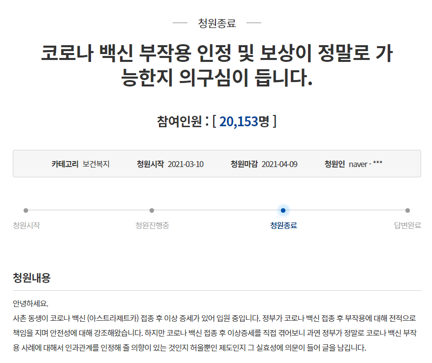 조카가 제 대신 국민청원 글을 적었습니다. 아마 백신부작용 첫 사례로 올라갔을 겁니다. 이후 국민청원 신속대응팀에서 전화 오고 시청에서도 전화 왔습니다. 시청직원도 똑같이 디스크로 발병이 됐다고 말하기에 기도 안 차더군요. 그래서 다 됐고 아이를 정상적으로 치료할 수 있는 병원으로 가도 되냐고 물었더니 처음에 입원한 병원에서 치료를 받아야 한다고 답하더군요. 역학조사관도 회의를 했는데 아들의 디스크 때문에 발병한 것 같다고 했습니다. 입원한 병원에서는 국민청원 글을 수정해 달라면서 병원 이름이나 의사의 이름이 미디어에 알려지면 구상권을 청구하겠다고 하더군요. 병원 측에서도 입원해 있으면 좋지 않으니 퇴원 처리하자는 말도 했습니다. 그래도 아이가 몸을 조금은 움직일 수 있어 이의신청도 하고 지난달 24일 퇴원해서 코로나검사를 받고 음성 받아 다음날인 25일부터 재활병원에 입원해 있습니다.