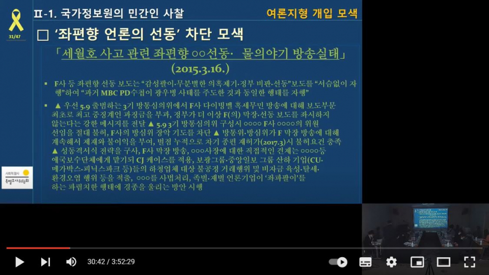 사참위는 지난 2일 제114차 전원위원회에서 정보기관(국정원 기무사)등의 민간인 사찰에 대한 조사 결과 중간보고서를 발표했다.