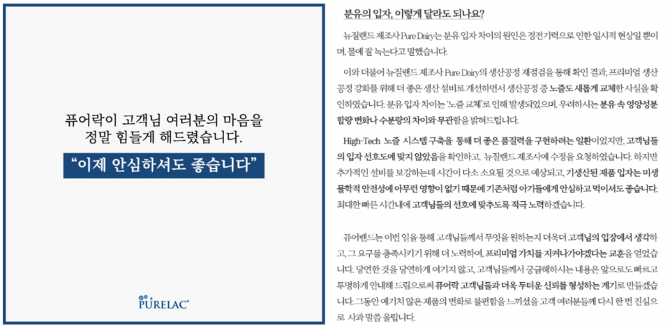 퓨어랜드 관계자는 “수입 단계에서 이미 안전성 검증을 받은 제품이지만 소비자 불안 해소를 위해 별도로 공식적인 인증절차를 다시 거쳤다”며 “현재 해당 제품은 적합 판정을 받은 상태고 이상 증상과 분유의 인과관계는 증명되지 않은 상황이지만 소비자들의 불안한 마음에 공감해 원하시는 분들에 대해서는 시기와 무관하게 환불 조치를 해드리고 있다”고 말했다.