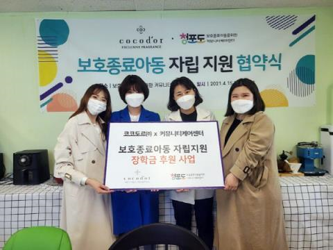지난 4월 보호종료아동을 위한 커뮤니티 케어 센터와 코코도르는 업무협약을 통해 보호종료아동 대학생들이 경제적인 어려움에 제한 받지 않고 학업을 진행할 수 있도록 매월 장학금을 지급한 바 있다. 또한, 이번 디퓨저 후원뿐만 아니라 추후에도 지속해서 보호종료아동들의 자립에 실제적인 도움을 줄 수 있는 다양한 물품지원을 확대할 방침이다.