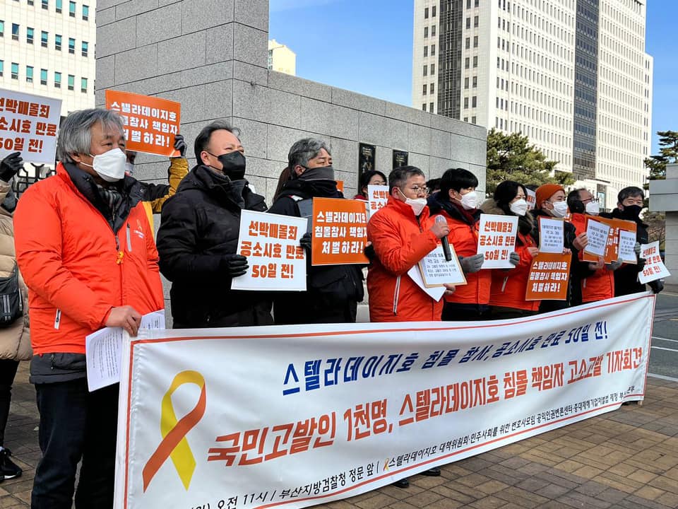 스텔라데이지호 대책위원회는 7일 오전 부산지방검찰청 정문 앞에서 ‘스텔라데이지호 침몰 책임자 고소·고발 기자회견’ 을 열었다.