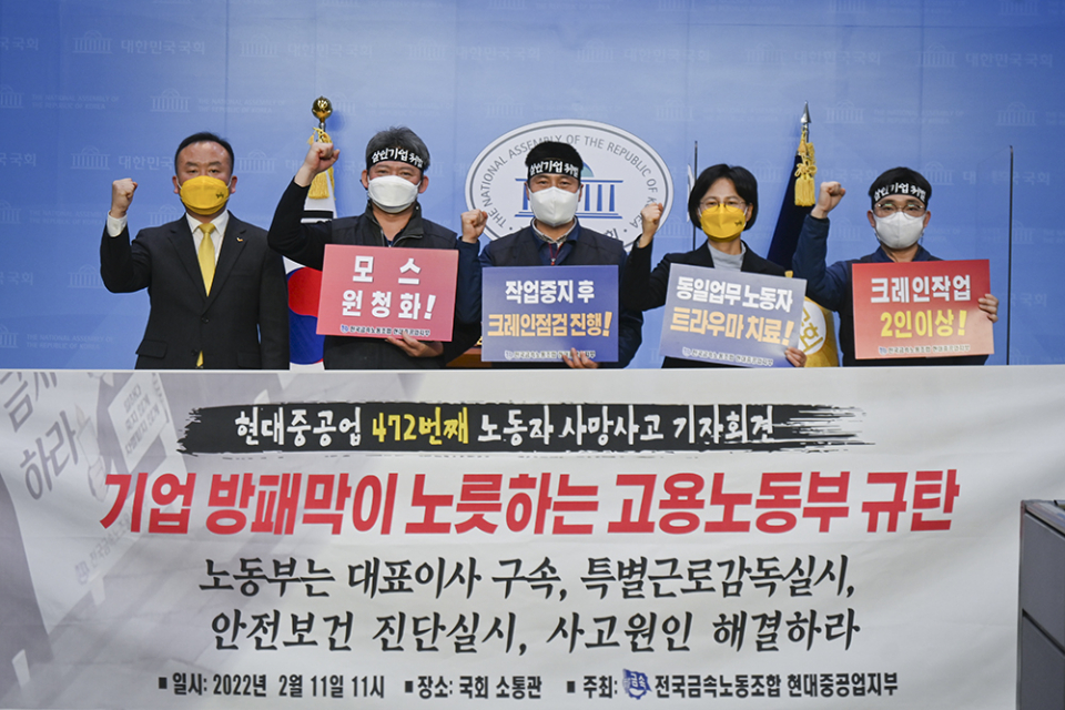 【투데이신문 강서희 기자】 정의당 강은미 국회의원(환경노동위원회, 예산결산위원회)은 11일 오전 국회 소통관에서 전국금속노동조합 현대중공업지부와 함께 현대중공업에서 지속 발생하고 있는 중대재해를 규탄하며 고용노동부의 적극적인 조치를 요구하는 기자회견을 열었다.