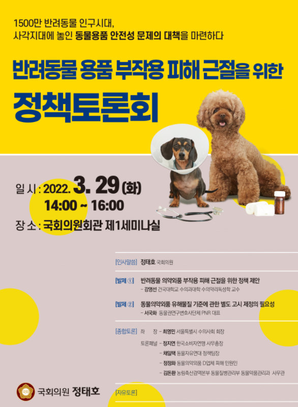 토론회에서는 반려동물 부작용 사례를 짚어보는 한편 반려동물의 특성에 맞는 ‘반려동물용 의약외품 안전기준’ 고시 제정 및 법안 마련의 필요성이 제기됐다.
