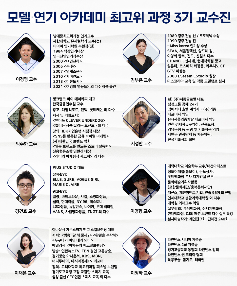 교육 과정은 패션과 라이프 스타일 디자인, 퍼스널 브랜딩, 워킹법, 스피치, 화술, 연기 등 차별화 된 커리큘럼으로 구성됐다.