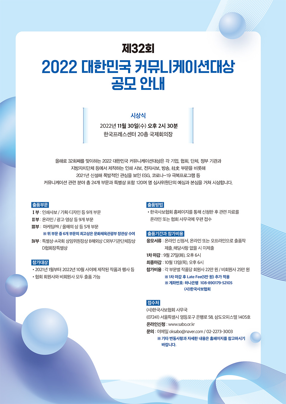 올해로 32회째를 맞이하는 ‘2022 대한민국 커뮤니케이션대상’은 각 기업(공기업) 또는 협회, 단체, 국가기관 등에서 발행하는 인쇄 사보 및 전자사보, 방송, 사사(社史), ESG 부문 등 신설 부문을 포함해 커뮤니케이션 등의 관련 분야 총 23개 부문과 특별상을 120여 명 심사위원단의 예선과 본선 심사를 거쳐 시상하게 된다.