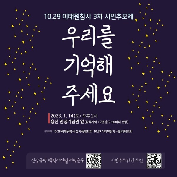 ‘진실, 책임, 연대의 2023년 우리를 기억해주세요’라는 제하로 열리는 이번 추모제는 이태원 참사를 잊지 않겠다는 다짐을 시민들과 공유하기 위해 마련됐다.